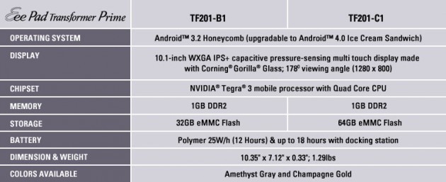 Allego, di seguito, una tabella riassuntiva con le caratteristiche tecniche di Asus Transformer Prime.