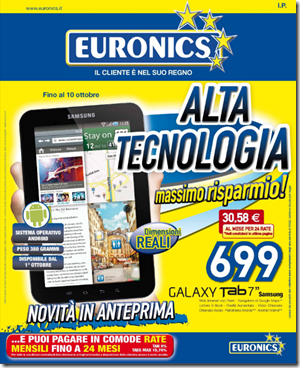 Ho ricevuto una comunicazione da Euronics che mi informa che, a partire dal 1 Ottobre, il Samsung Galaxy Tab sarà in vendita presso i loro punti vendita al prezzo di 699€.