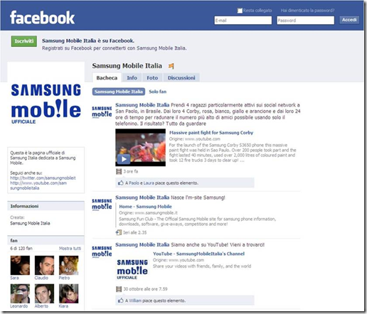 Dopo http://www.twitter.com/samsungmobileit , Samsung Mobile ha il piacere di annunciare la nascita della sua pagina ufficiale italiana su Facebook ed il canale ufficiale di YouTube dove poter essere aggiornati su news, aggiornamenti, anticipazioni, curiosità, eventi, video e tutorial legati alla sua gamma di cellulari.