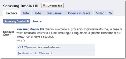 Come è possibile notare dallo status di Samsung, presto arriverà un nuovo firmware per Omnia HD, che introdurrà il tanto atteso scrolling cinetico sullo smartphone di punta di Samsung.