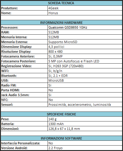 4Geek Horus è il primo smartphone Android di fascia alta ma venduto ad un prezzo molto concorrenziale.Lo smartphone, basato su OS Android Froyo 2.2, è infatti acquistabile per soli 289€, un prezzo ver...