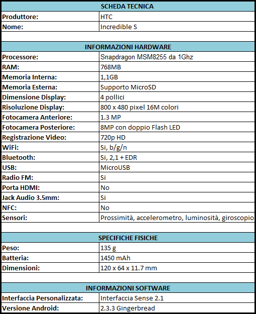 Scheda Tecnica HTC Incredible S