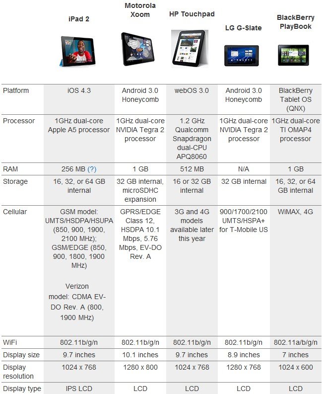 Scontro tra tablet: iPad 2 Vs XOOM Vs OptimusPad Vs Playbook Vs TouchPad Vs Galaxy Tab 10