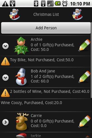 Con questa applicazione potrete decidere inizialmente il budget totale di spesa per i regali e l'elenco delle persone assegnando a ciascuno di loro il regalo, dove acquistarlo e il prezzo relativo; successivamente una volta che avrete comprato parte dei regali assegnerete la dicitura "acquistato" di fianco al nome della persona e l'applicazione vi mostrerà il prezzo parziale della spesa nella vostra lista.
