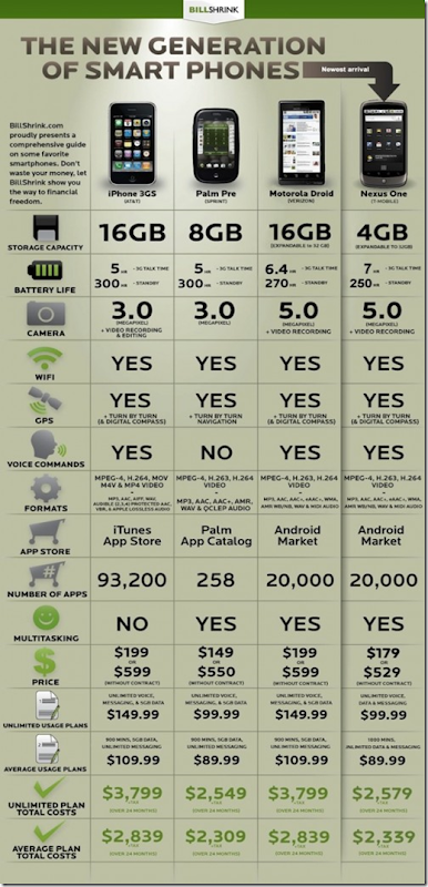 Date un’occhiata a questa tabella, davvero molto interessante, che mette a confronto alcuni degli smartphone più chiacchierati e desiderati degli ultimi mesi, compreso il nuovissimo Nexus One di Google.