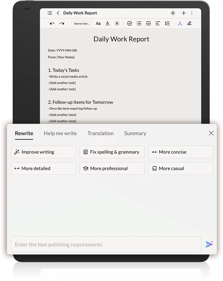 Supporta PDF, Word, PowerPoint, Excel, EPUB, MOBI, AZW3, CBZ e CBR. Installa APK di terze parti e usa Google Drive, Dropbox e Kindle. La modalità schermo diviso permette il multitasking.