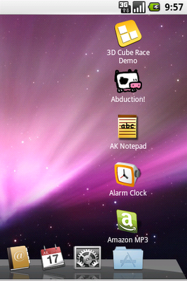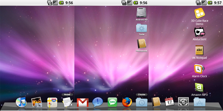 Il tema in questione ripropone, aOSX, ripropone le principali features presenti sul desktop dell’OsX 10.5, con un vero e proprio dock suddiviso nelle 3 schermate che caratterizzano Android. Insomma, una riproduzione davvero ottima sotto ogni punto di vista.