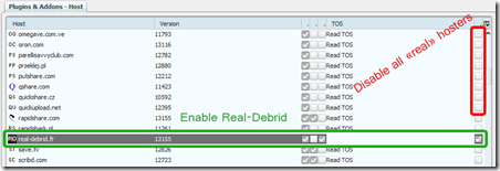 - Disabilitate tutti i file hosting, togliendo la spunta da Use plugin, e lasciate attivo solamente Real-Debrid.