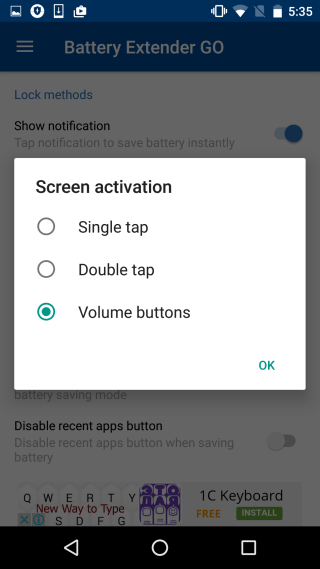 Potete scegliere se usare i pulsanti volume, il doppio tap o il single tap. Fatto questo, fate uno swipe nella tendina delle notifiche su Android e cliccate sulla voce ‘Tap here to save battery’. Lo schermo di Android si spegnerà in automatico.