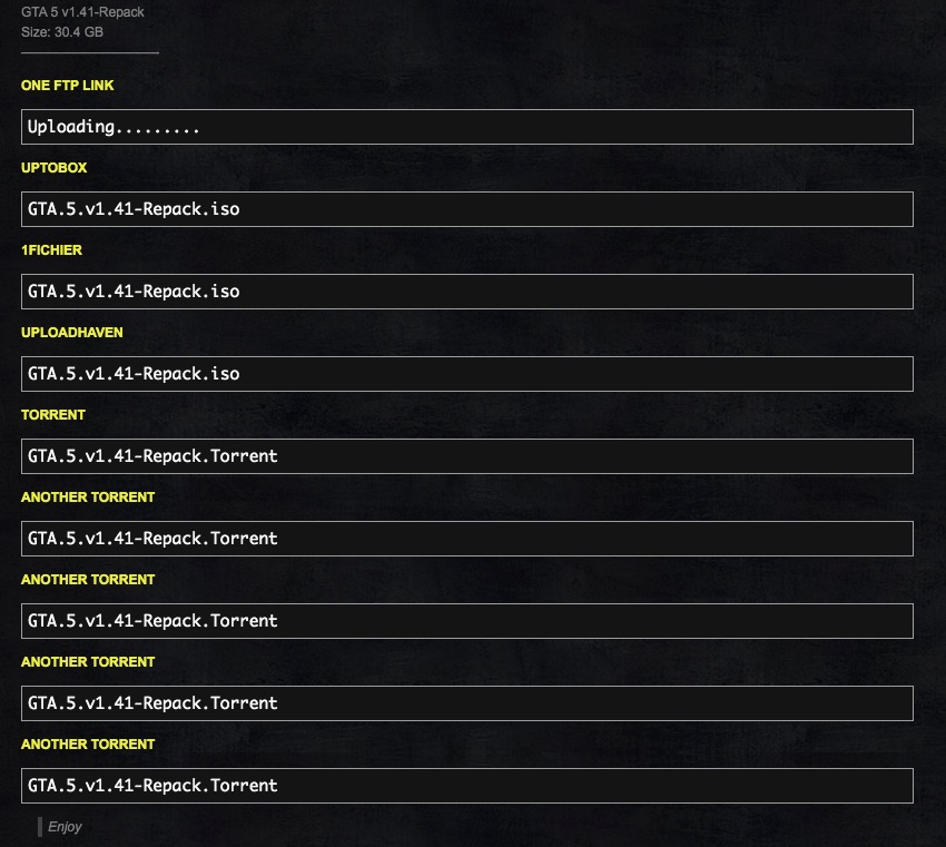 - nella pagina che si apre, troverai tanti link per scaricare il gioco: scegli la modalità di download che preferisci. La modalità migliore e più veloce è quella "ONE FTP LINK", che in pratica ti fa scaricare direttamente il gioco in un click. Peccato che questa modalità non sia sempre disponibile. Tra le modalità di download alternative, ci sono quelle Torrent o i vari siti di file hosting (tra questi consiglio uploadhaven uptobox o uptobox quando sono disponibili). Ad esempio, cliccando sul link uploadhaven verrai rimandato ad un sito esterno che ti permetterà di scaricare il gioco seguendo le istruzioni che compaiono a schermo