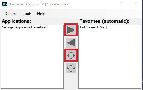 - Aprite il programma Borderless Gaming software (da Amministratori di Windows) e mettete Just Cause 3 tra i Preferiti, come da immagine seguente
