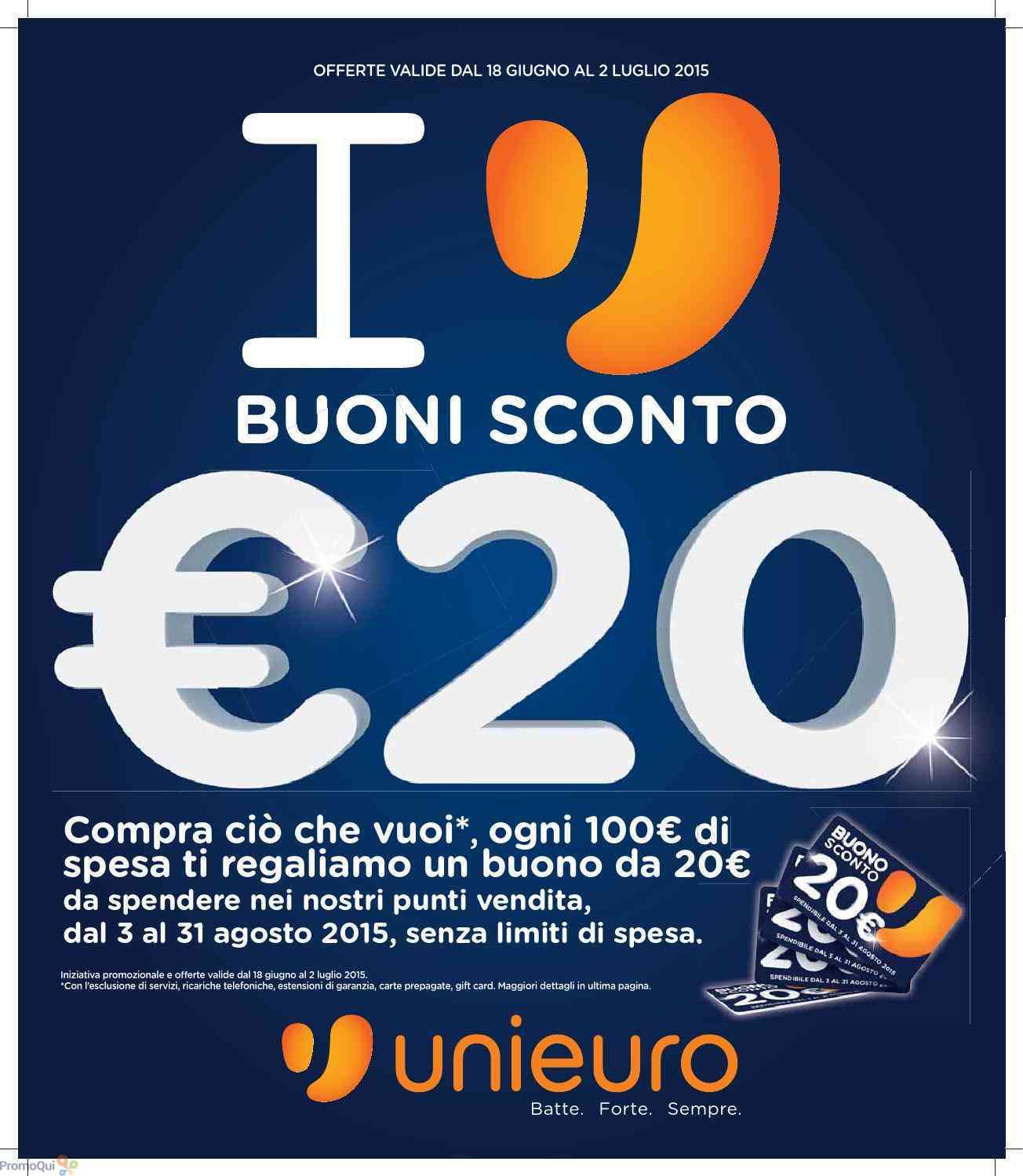 Da Unieuro è sempre tempo di sconti e nell'ultimo volantino di Giugno 2015 valido dal 18 Giugno e fino al 2 Luglio 2015, non sono presenti offerte incredibili ma in pratica potrete ottenere il 20% di sconto in buoni sconto. Infatti ogni 100 euro di spesa otterrete un buono sconto di 20 euro da utilizzare per qualsiasi acquisto dal 3 al 31 agosto senza limiti di spesa.
