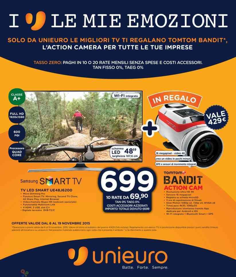 Unieuro continua a spingere forte con offerte diversificate su tutti i settori dell'elettronica e non solo ed a Novembre è l'ora delle televisioni con tante offerte che partiranno da domani venerdì 6 novembre e sarà valido fino al 19 Novembre con tante offerte interessanti ed un abbinamento particolare che permetterà di avere in regalo l'action cam TomTom Bandit con l'acquisto di alcune TV di prezzi diversi.