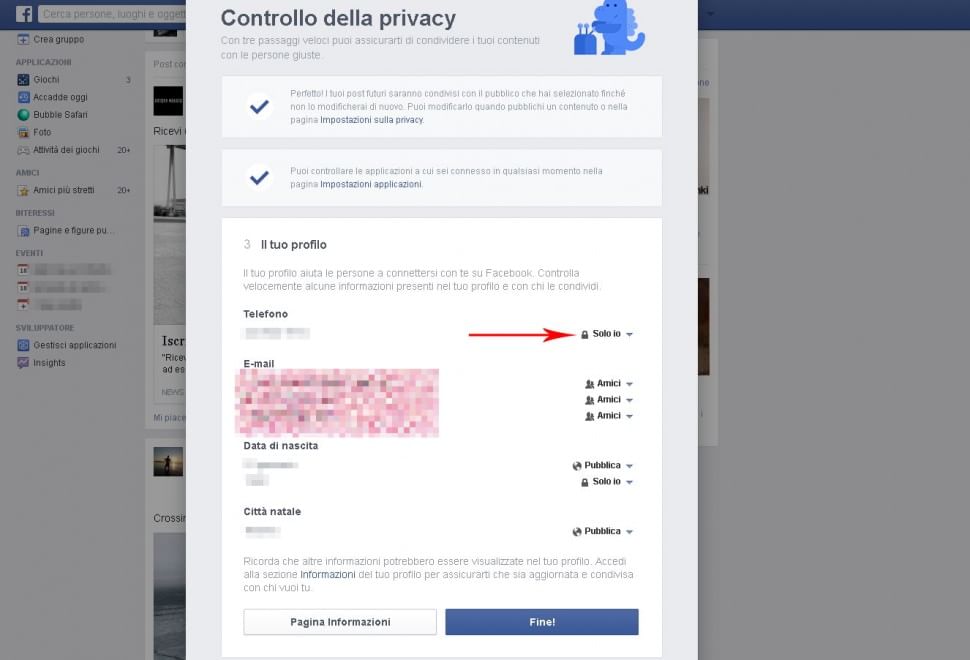 La protezione dei nostri dati personali è possibile farla limitando l'accesso alle informazioni riservate impostando al fianco di ogni sezione la privacy.