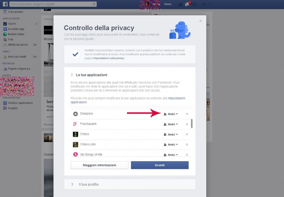 Sempre sotto la sezione Impostazioni -> Privacy accediamo al pannello di impostazioni delle Applicazioni da dove potremo impostare il grado con la quale l'applicazione pubblicherà i post sul nostro account impostando la Privacy.