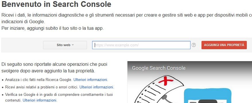 Ora che sei al primo passo, copia ed incolla l'indirizzo completo del tuo sito, ed esempio https://www.yourlifeupdated.net, e clicca su AGGIUNGI UNA PROPRIETA'.