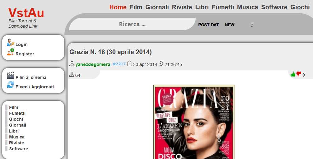 VstAu ci è stato suggerito da un nostro lettore e subito mi ha incuriosito, ho fatto un salto ed ho trovato tantissimo materiale suddiviso nelle più comuni categorie come Film, Giornali, Riviste, Libri, Fumetti, Musica, Software e Giochi. Soprattutto la sezione Riviste è aggiornatissima con i maggiori quotidiani presenti già all'alba.
