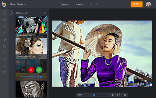 Dalla comoda barra laterale potete accedere a tutte le funzioni disponibili così da poter iniziare a modificare la vostra foto caricata in locale oppure online il tutto in pochi click.
