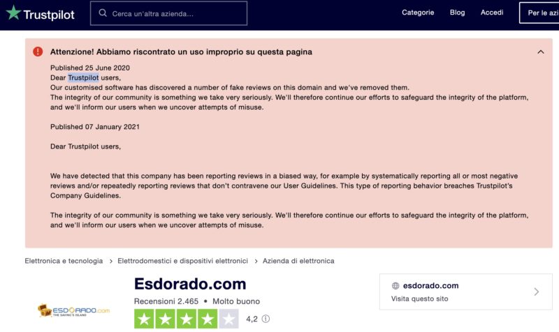 Il problema è che Trustpilot ha fatto comparire un messaggio in pagina dove dice che ha riscontrato tante recensioni FALSE.