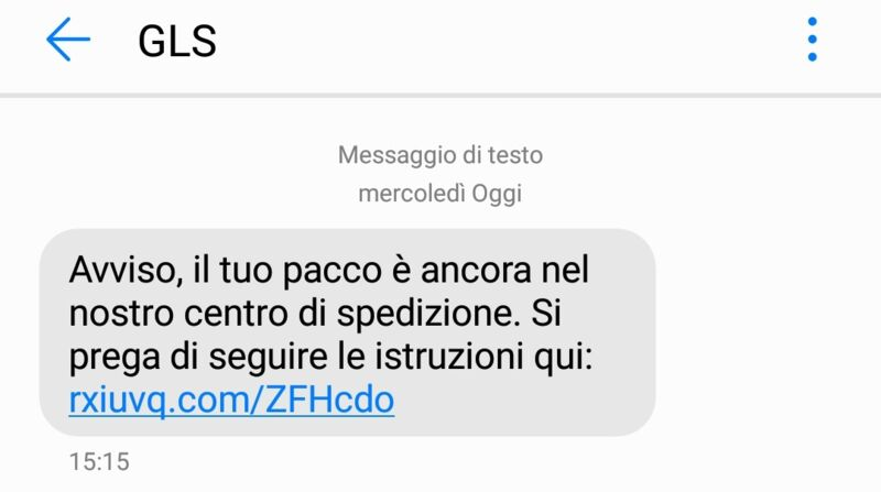 Attenzione al messaggio SMS che viene inviato a nome di GLS, si tratta di una truffa. Attento alla truffa SMS GLS il tuo pacco è ancora nel nostro centro