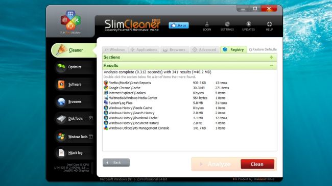SlimCleaner è un programma simile a CCleaner per quanto riguarda funzionalità e tool offerti: permette di cancellare file temporanei, disinstallare programmi, gestire le estensioni del browser internet e ovviamente di ottimizzare il registro di sistema. Ci sono anche funzionalità avanzate per gestire al meglio il menù Start e le Notifiche di Windows.