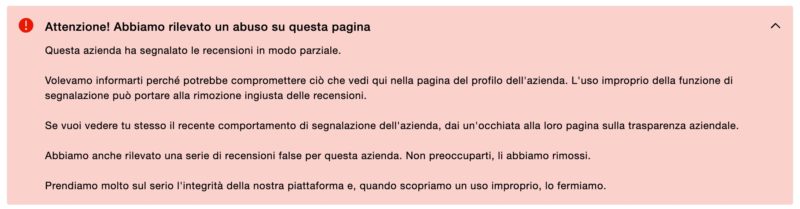 Da segnalare, però, che TrustPilot mette un grosso messaggio in pagina dicendo che è stato rilevato un abuso sulla pagina, con anche recensioni false (non sappiamo se positive o negative).