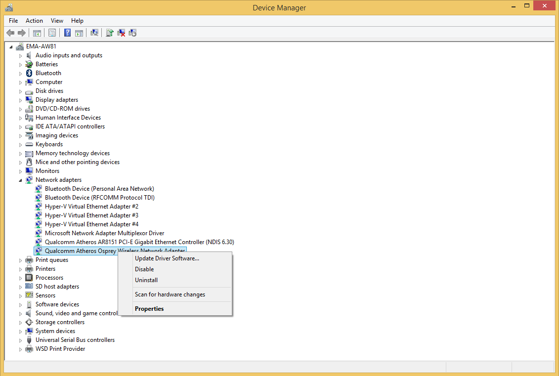 netsh wlan set hosted mode=allow ssid=TetherX key=1234567890netsh wlan start hostedSe il secondo comando non funzionasse, sarà necessario disattivare e successivamente riattivare la scheda di rete wireless del vostro PC o tablet. Per farlo clicchiamo con il tasto destro sul pulsante Start e selezioniamo Gestione Dispositivi. Clicchiamo quindi sulla freccina in corrispondenza della voce Schede di Rete. Selezioniamo quella wireless, facciamo click destro su di essa e selezioniamo Disattiva. Appena compare una freccina verso il basso sull’icona possiamo riattivare la scheda con la stessa metodologia di prima: click destro sulla scheda di rete e poi Attiva.