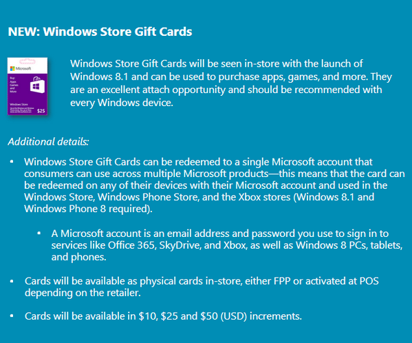Le gift card saranno associabili ad un singolo account Microsoft, ma saranno utilizzabili sulle diverse piattaforme contemporaneamente. Sarà quindi possibile utilizzarle sugli Store di Windows 8.1, Windows Phone e Xbox. Le gift card saranno acquistabili nei negozi fisici, sotto forma di coupon o come ricarica tramite POS.