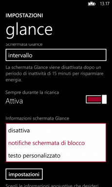 "Consente di visualizzare l’ora e offre utili notifiche quando il telefono è in standby. Permette di scegliere la modalità Glance dello schermo che più si adatta alle tue esigenze e ottenere il giusto equilibrio tra consumo energetico e visibilità. Consente di selezionare la modalità notturna e la schermata Glance riduce automaticamente la luminosità dello schermo negli intervalli di tempo impostati. Scarica Glance e cercala in Impostazioni". Questa la descrizione dell'applicazione Glance di Nokia per tutti i Lumia WP8 presente sul Windows Phone Store.