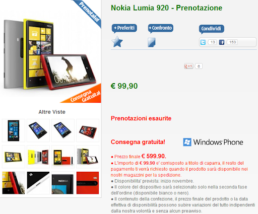 Ricordiamo inoltre che circa 10 giorni fa anche il sito NStore ha dato il via ai preordini di Nokia Lumia 920: con un acconto di 99,90 € si offriva agli utenti di portare a casa al day one il nuovo Windows Phone 8 di Nokia.