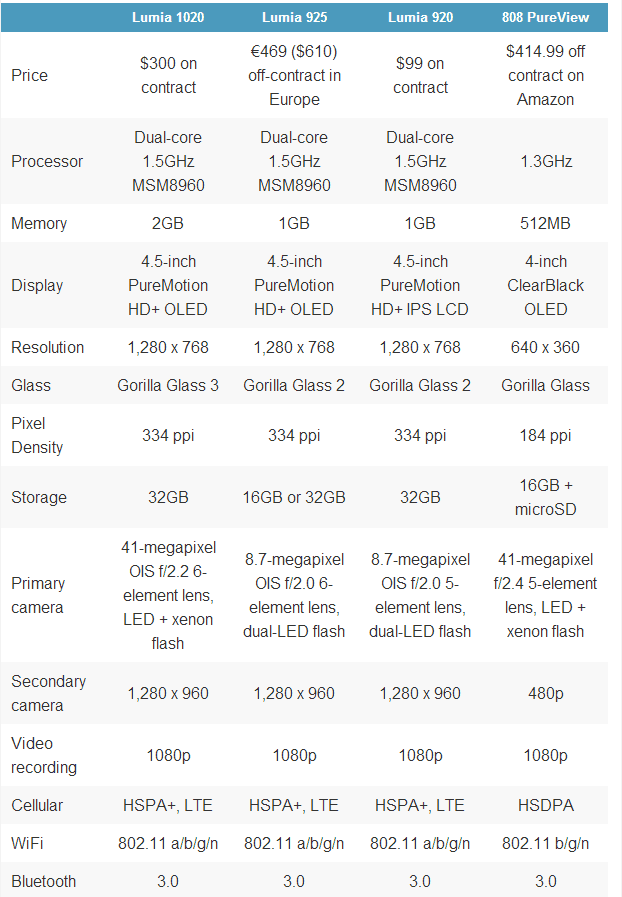Differenze, caratteristiche, schede tecniche a confronto tra Nokia Lumia 1020 vs. 925 vs. 920 vs. 808 PureView