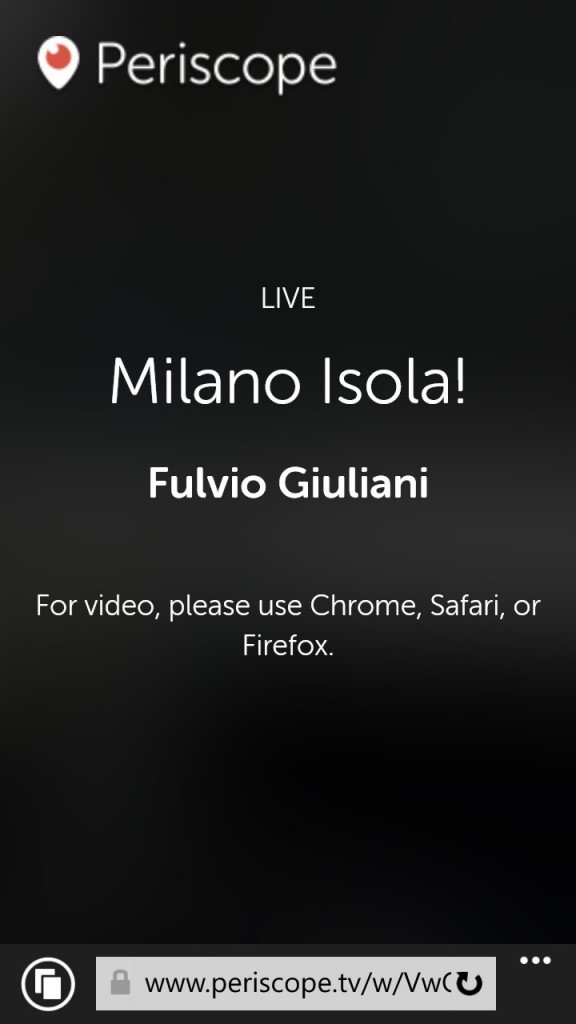 Conosciamo tutti la procedura classica per visualizzare uno streaming offerto da Periscope, via Twitter l'utente rilascia un link di accesso alla diretta e contestualmente viene aperta l'applicazione di Periscope, su Windows Phone invece veniamo reindirizzati sul browser, in questo caso Internet Explorer in cui ci verrà mostrata questa schermata: