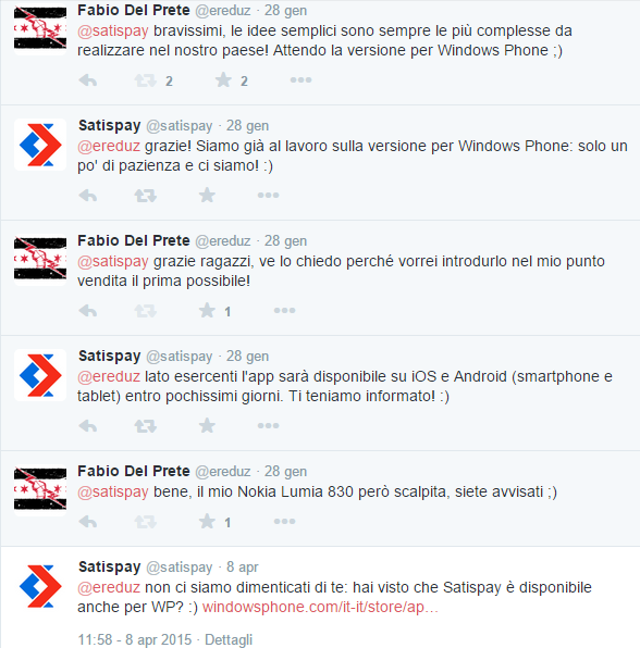 La notizia è fresca fresca, gli amici dello staff di Satispay hanno mantenuto la promessa di avvisarmi quando la loro applicazione sarebbe stata rilasciata anche per Windows Phone, sono stati di parola e ve lo dimostriamo direttamente dalla nostra conversazione su Twitter: