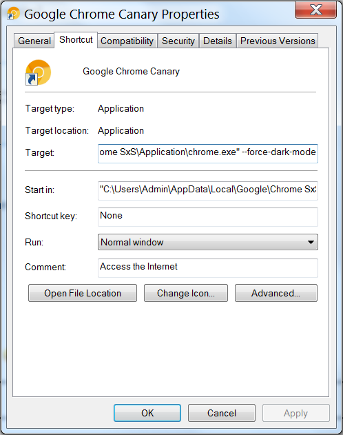 - una volta che hai scaricato e installato questo browser, puoi attivare manualmente la Dark Mode facendo clic con il pulsante destro del mouse sul collegamento Chrome Canary (quello sul desktop del tuo PC), scegliendo Proprietà e aggiungendo “Force-dark-mode” alla linea Target, come vedi qui sotto:
