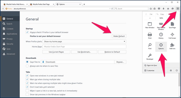 Su Firefox, cliccate nel menù in alto a destra con le 3 righe orizzontali e andate in Opzioni. Comparirà una scheda con scritto Generali: da qui, come da immagine, controllate che alla voce StartUp ci sia la spunta, quindi cliccate sulla voce Make Default.