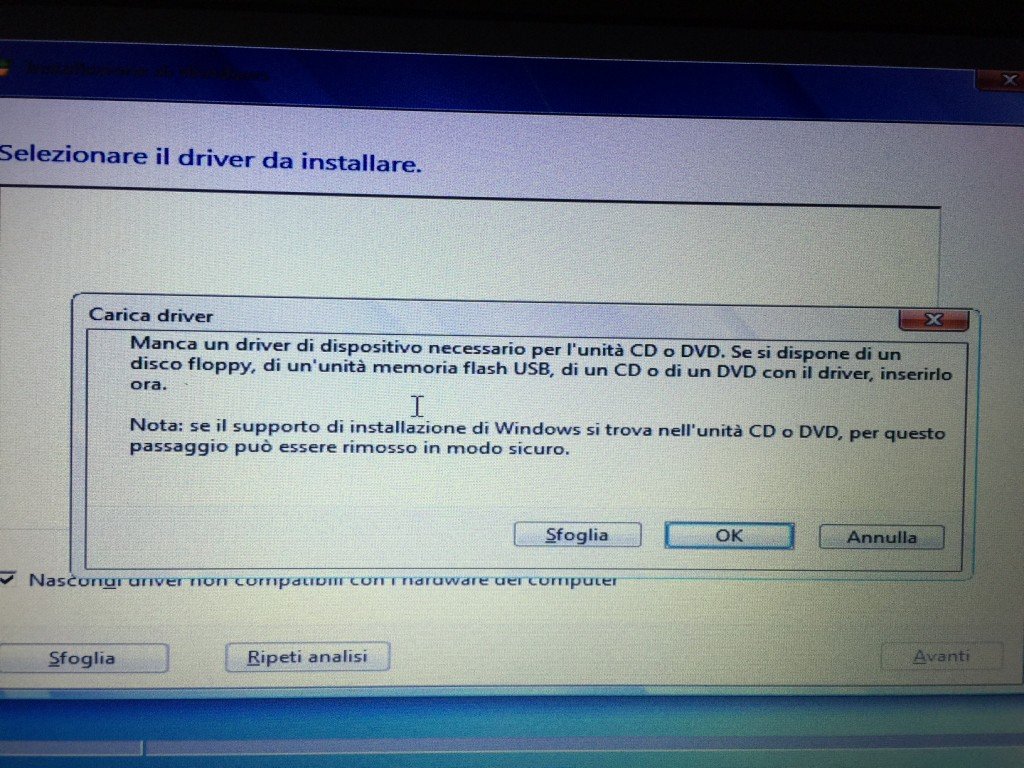 Parte la configurazione iniziale del sistema, legge la chiavetta USB, si avvia la procedura di installazione di Windows ma immediatamente mi scontro con il problema che vedete nell'immagine presente in apertura articolo. Il messaggio è "Non è stato trovato alcun driver di dispositivo" . Clicco su OK e dunque mi fermo li perchè non riesco ad installare Windows 7.