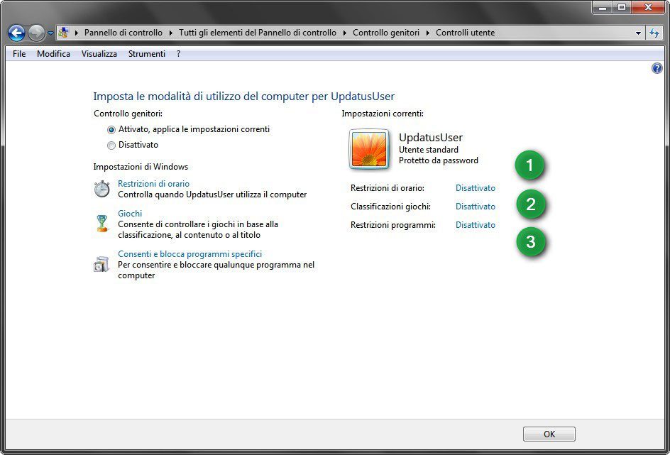 Ora che abbiamo creato l'account andiamo su Controllo genitori da dove dovremo accedere all'account appena creato e nella pagina relativa all’account utente dovete attivare il controllo genitori selezionando l'opzione Attivato, applica le impostazioni correnti per proteggere l'account con le impostazioni standard e confermiamo con un OK. Ora che abbiamo attivato il controllo genitori dobbiamo aprire i link proposti nella schermata per configurare gli orari d'uso del PC, come giochi autorizzati e le applicazioni che il bambino può usare anche senza la nostra supervisione.