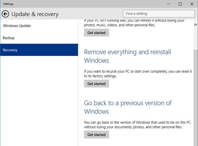 - Cliccate su "Get Started" in corrispondenza di “Go back to a previous version of Windows” e seguite le istruzioni a schermo per fare il downgrade. La procedura è automatica e in circa 30 minuti (indicativamente) potrete abbandonare Windows 10 e tornare alla precedente versione di Windows.
