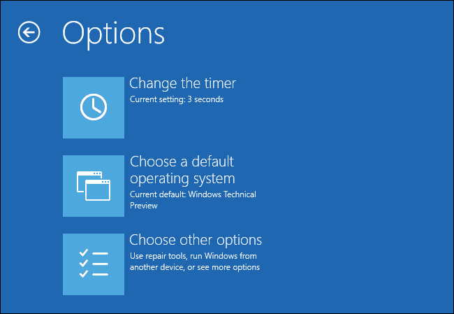 Infine, segnalo che cliccando sul menù “Change defaults or choose other options” potrete modificare le opzioni di avvio del vostro PC: potrete decidere quale sistema avviare in automatico, a quale dare la precedenza, quanto tempo aspettare prima dell'avvio automatico di uno dei due sistemi operativi e così via.