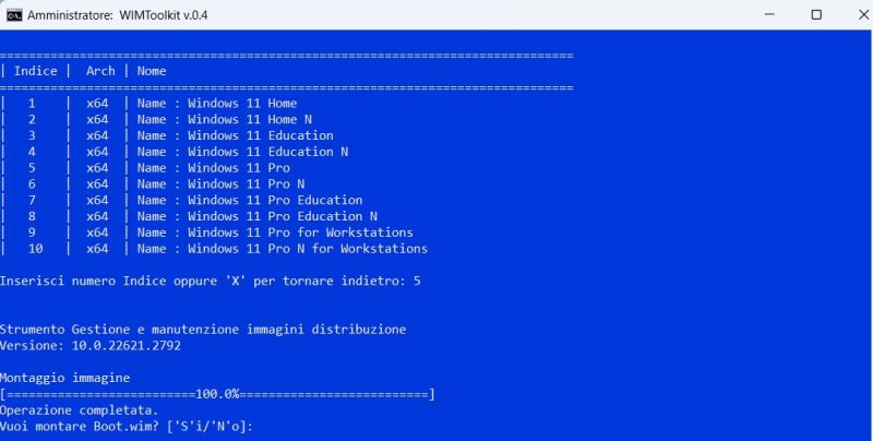 Quando ti chiede se vuoi montare Boot.wim, conferma premendo S