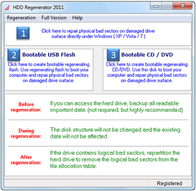 Come avrai già capito, HDD Regenerator è uno strumento semplice ed efficace per il recupero di settori danneggiati e la superficie di un disco rigido magnetico.