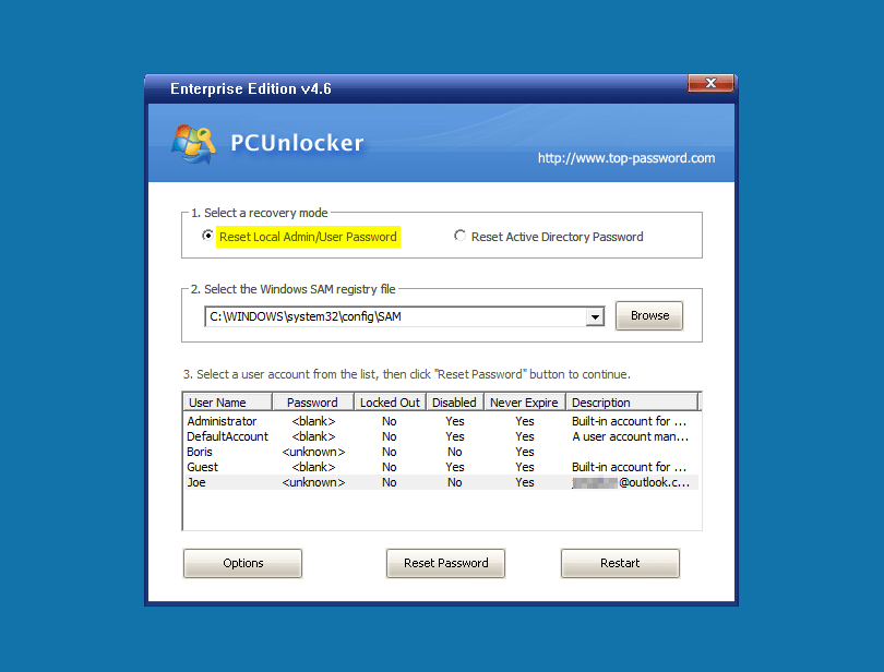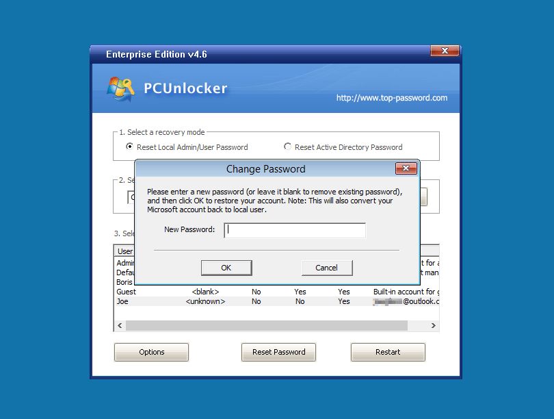 Una volta che sarai riuscito ad avviare PCUnlocker, le cose diventeranno molto più semplici.
