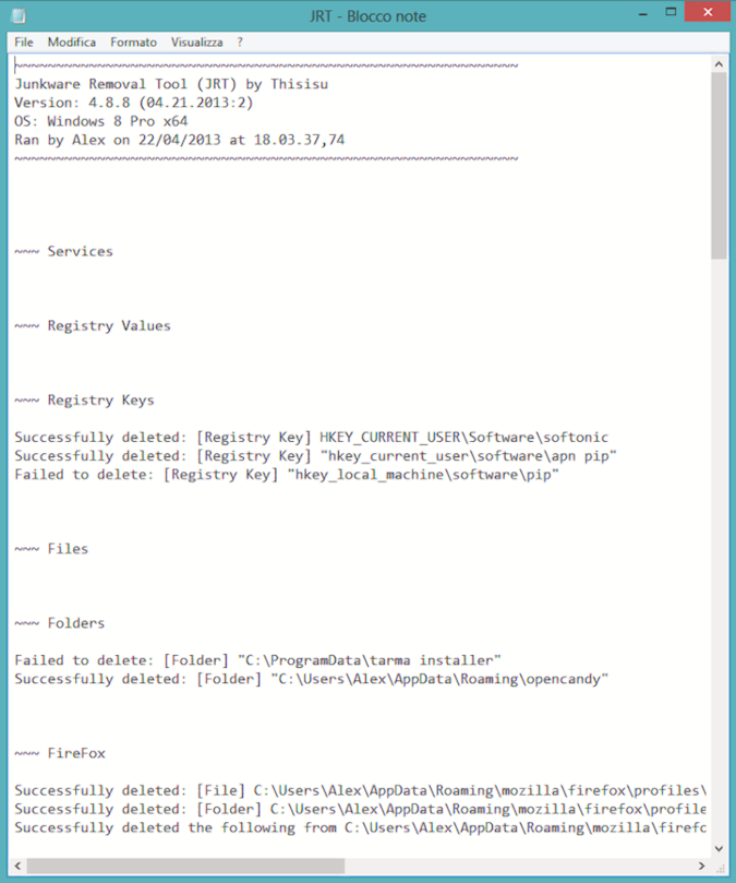 Al termine della procedura automatica, comparirà un messaggio che vi avvertirà che la scansione è conclusa e vi segnalerà un resoconto dei log con tutte le rimozioni avvenute con successo.