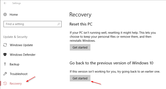 Basta andare in Impostazioni > Aggiornamenti e sicurezza > Ripristino e da qui devi cliccare sulla voce "Get Started" sotto alla voce "Torna ad una precedente versione di Windows 10" come da immagine.