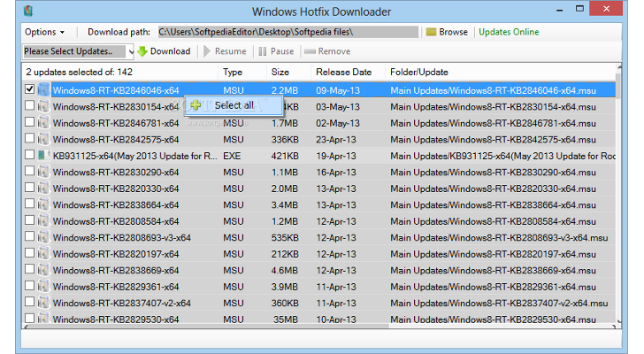 Non è necessario che il prodotto sia installato sul PC. Selezioniamo gli aggiornamenti o scegliamoli tutti cliccando col il tasto destro su una voce e cliccando su Select All. Verifichiamo che il percorso di salvataggio Download path sia esatto altrimenti modifichiamolo con Browse.