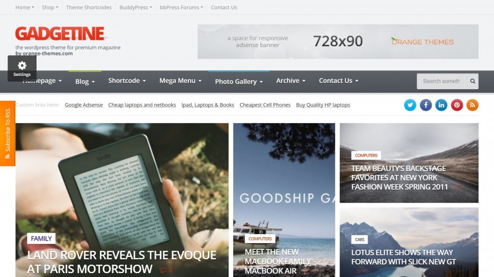 Gadgetine è il secondo mio preferito e sebbene non abbia una grafica come i precedenti. ha diverse opzioni per impostare la home come un magazine vero ma anche per chi punta alle affiliazioni per monetizzare grazie ai numerosi spazi pubblicitari e l'integrazione con Google Adsense. Social, impaginazione, ridimensionamento immagini e oltre 10 spazi per i banner sono i punti di forza di questo tema.