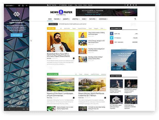 Newspaper è quello con più funzioni ed integrazioni disponibili. Infatti ha di base tantissimi moduli, oltre 100 per personalizzare il sito, 40 demo installabili con un click e si integra con bbPress, BuddyPress, Buddy Press, Yoast SEO e WooCommerce. Con Visual Composer possiamo creare le nostre pagine con il semplice trascinamento, supporta le ultime guide di SEO e supporta Google AdSense.